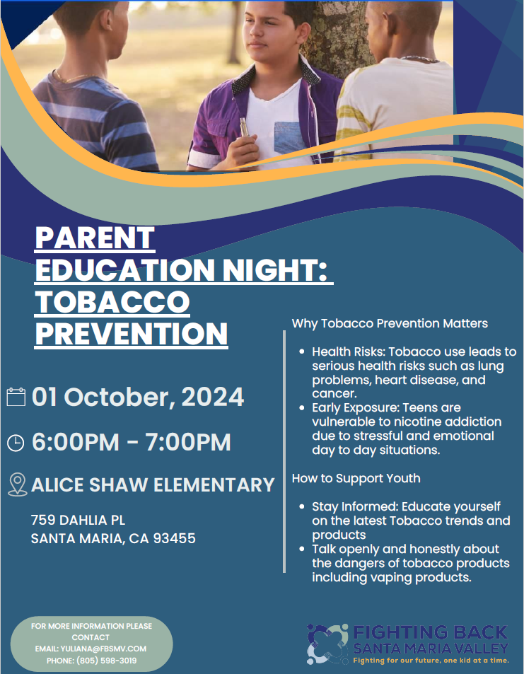 All Orcutt Union School District families are invited to a parent education night on tobacco use prevention to be held on Tuesday, October 1, from 6:00-7:00 p.m. at Alice Shaw School, 759 Dahlia Place. Presented by Fighting Back Santa Maria Valley, the night will explore the latest tobacco use trends and products, including vaping, and how parents can steer their children away from such use. This is a pertinent topic for our community, and everyone is welcome to attend.