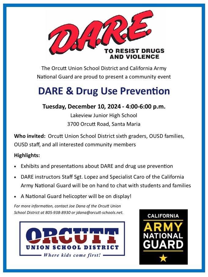 The Orcutt Union School District and California Army National Guard would like to invite the entire community to DARE and Drug Use Prevention, a special event scheduled for Tuesday (December 10) from 4:00-6:00 p.m. at Lakeview Junior High School, 3700 Orcutt Road.